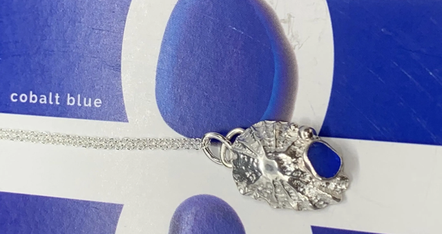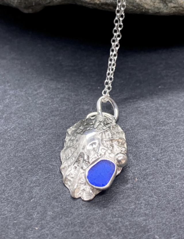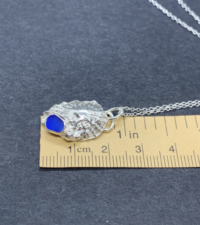 Sterling silver Seashell pendant hand-moulded into a beautifully textured solid limpet shell with a bright cobalt blue seaglass nugget in a sterling silver bezel setting and hand formed silver ‘bubbles’. The pendant is hand moulded from a real limpet shell using solid 925 silver PMC (precious metal clay).